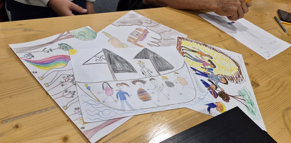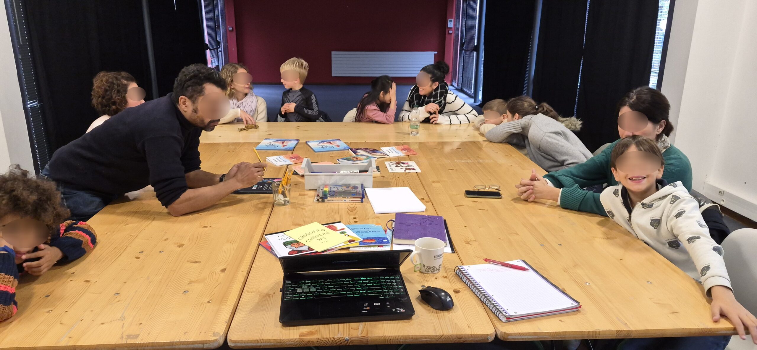 J’aime particulièrement ces ateliers parents-enfants qui tissent une complicité originale entre eux. Qui les aident à se découvrir autrement… Là encore, l’atelier ne fait pas exception. Adultes et enfants font équipe pour élaborer l’aventure puis pour l’illustrer. Ce n’est pas simple pour un adulte de dessiner au vu de tous, d’assumer un talent que l’on a plus ou moins. Heureusement que les enfants sont là pour les aider 😉