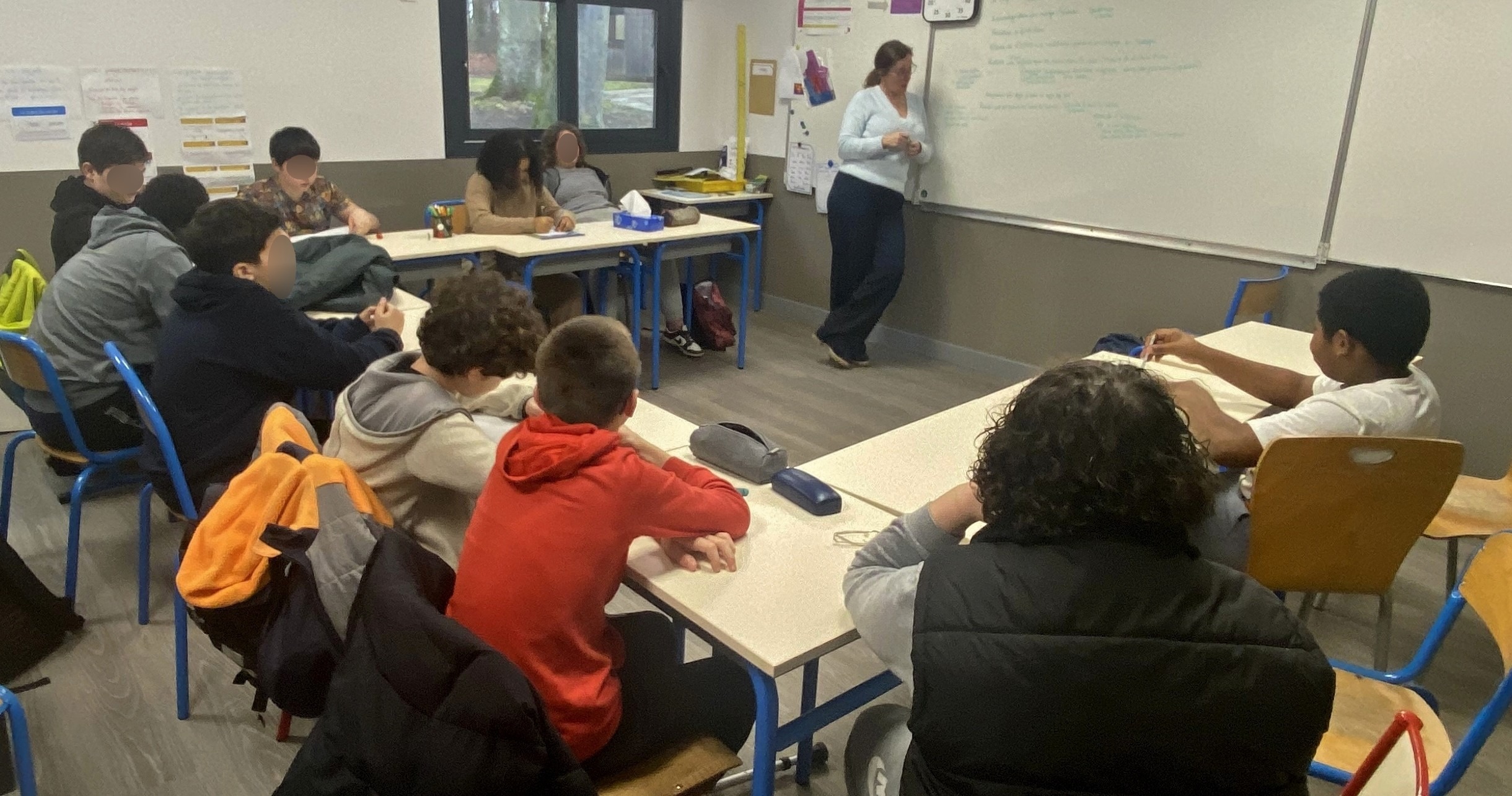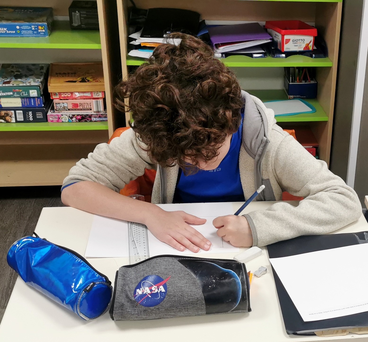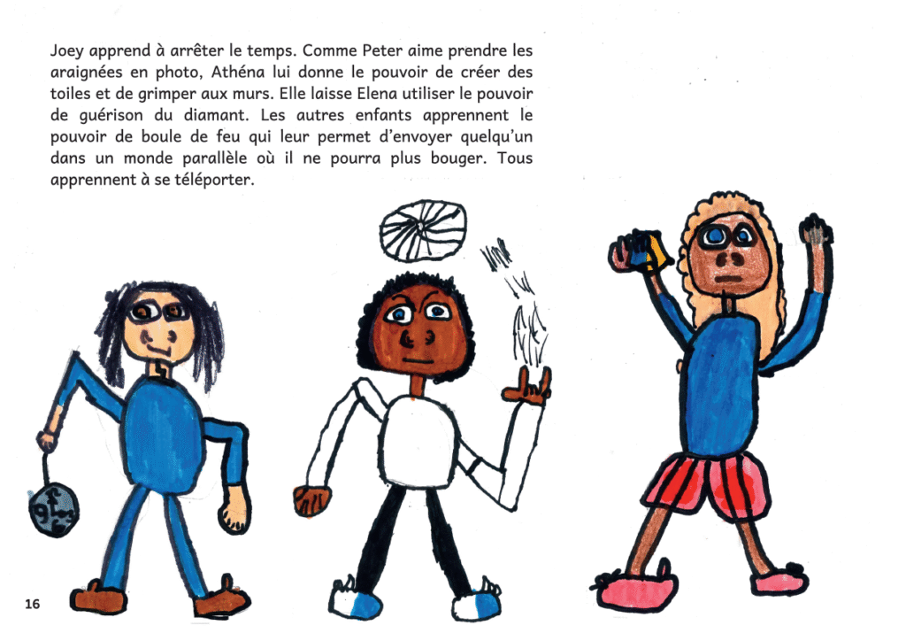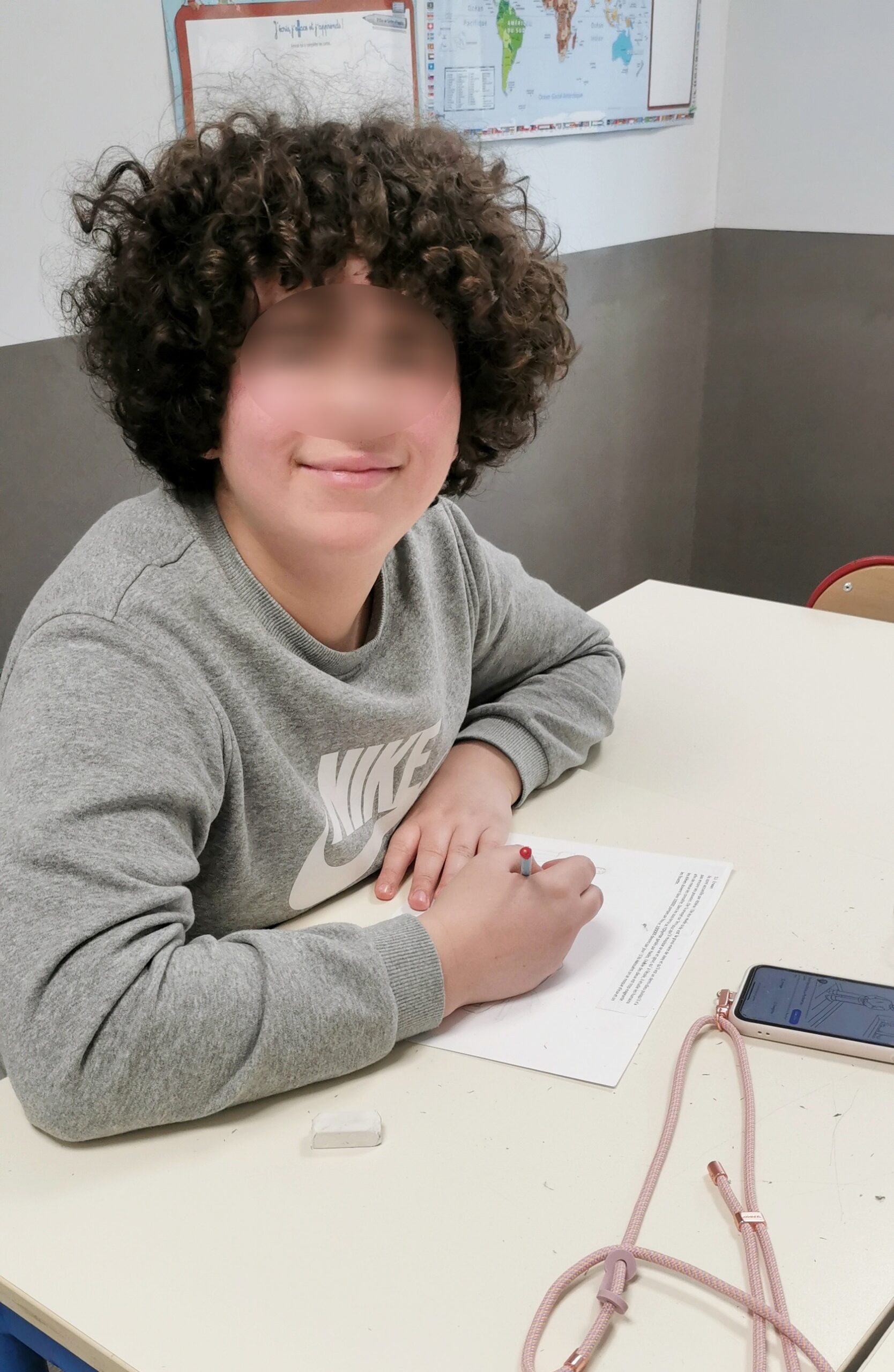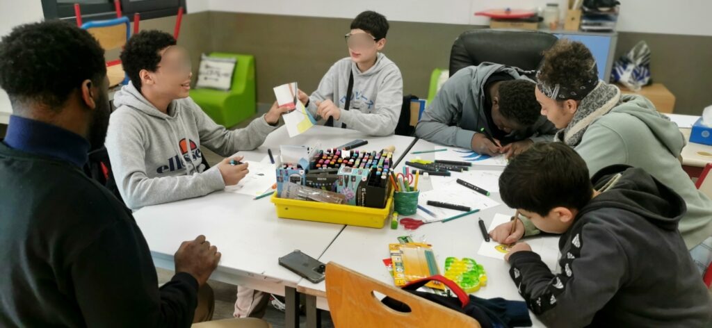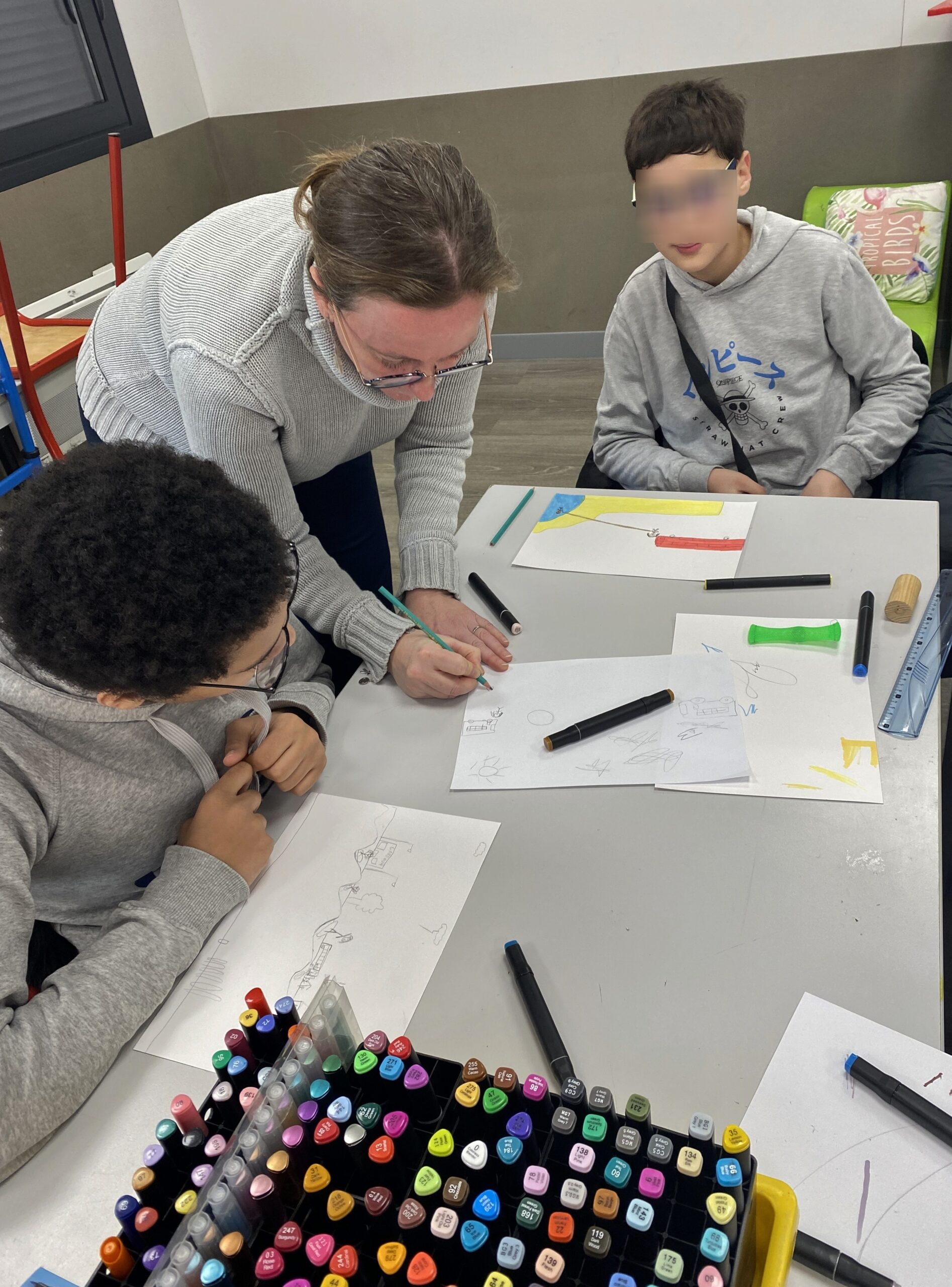 De retour donc avec une classe cette fois et la même enseignante super motivée que lors de notre première aventure. Accompagnée par une seconde enseignante qui découvre l’activité et les éducateurs. Certains enfants ont déjà participé en 2023 et d’autres doivent se lancer pour la première fois. Evidemment, ils sont intimidés, ils sont agités aussi ou bien…l’un d’entre eux est comme endormi sous sa capuche sur sa table. Il ne veut pas relever la tête, il ne veut pas participer. Je l’interpelle une ou deux fois puis le laisse tranquille. Les autres petit à petit s’intéressent, entraînés par les anciens qui ont vite retrouvé le rythme et par les encadrants qui ont visiblement très envie de donner des idées pour l’histoire.